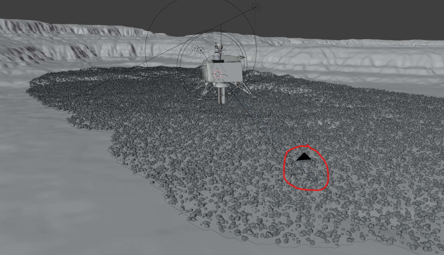 The following images show how the environment was structured. A main height-map based geometry and a secondary high-poly mesh for detailed displacement near the camera (circled) were used to craft the final environment.
